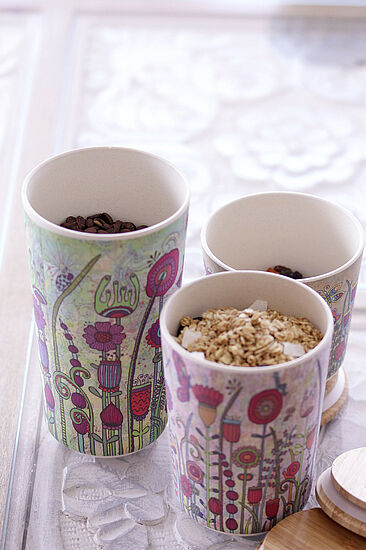 Über die Produkte: Die im 3er Set, in einer limitierten Auflage von 1.500 Stück erhältlichen, Aufbewahrungsdosen by Rollin’Art bringen gute Laune in Küche, Wohn,- Schlaf,- oder Badezimmer. Zur aromafrischen, längeren Aufbewahrung von Lebensmitteln in der Küche für Schrank oder Regal besitzen die aus hochwertigen, nachhaltigen Bambusfasern gefertigten Dosen einen luftdichten Silikonring. Für den Schrank viel zu schade, eignen sie sich aber auch als dekorative Elemente im ganzen Haus.