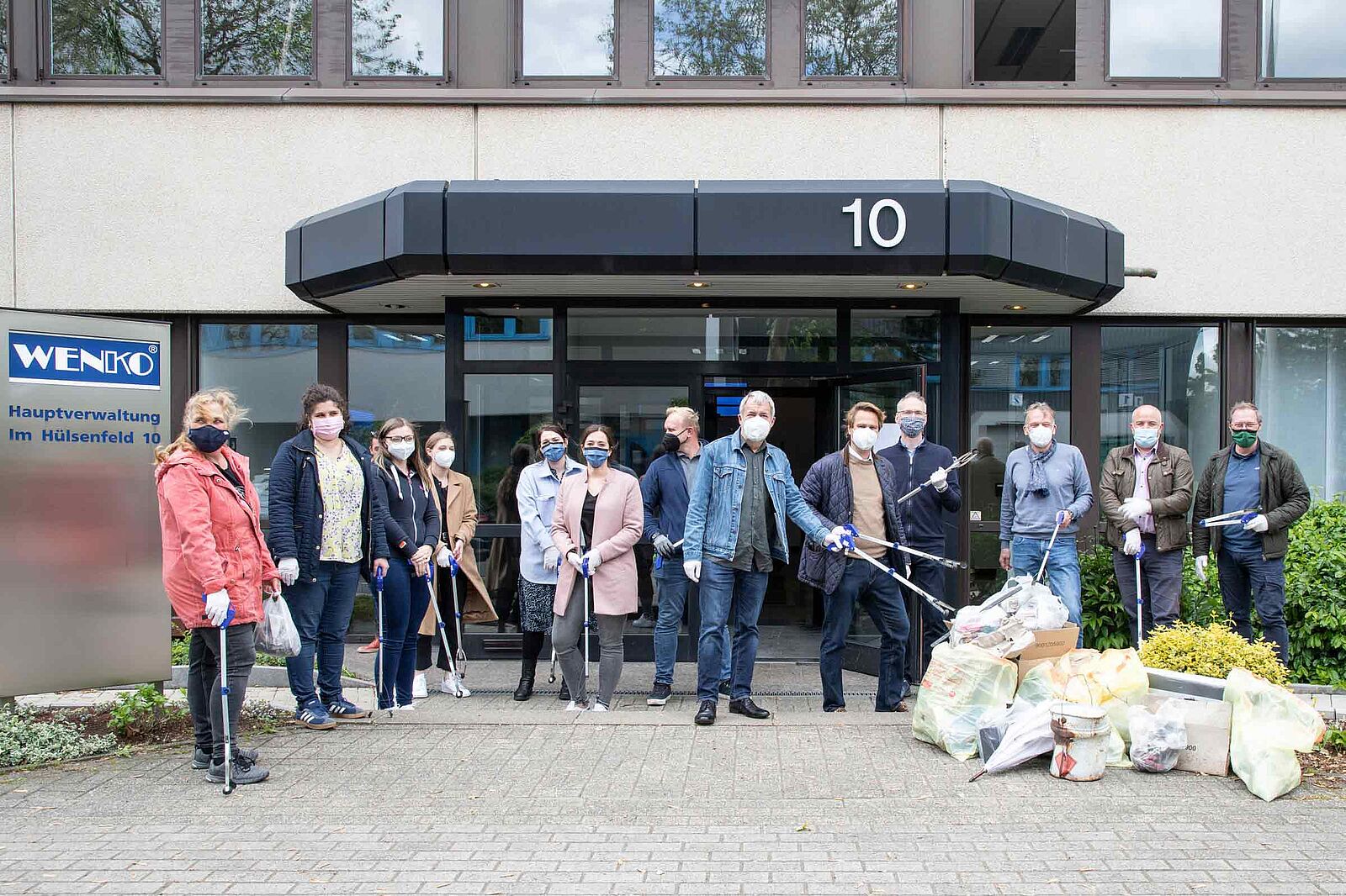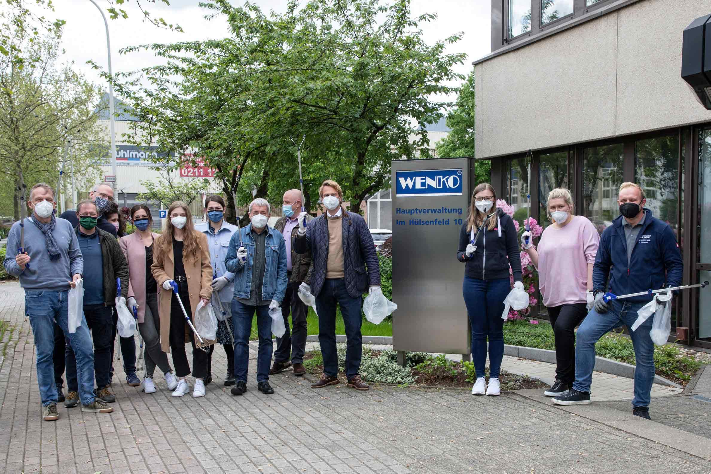 Hilden, 27. Mai 2021. Zu einer ungewöhnlichen Aktion hat WENKO-Chef Niklas Kölnner seine Mitarbeiter am Freitag den 21. Mai, aufgerufen. Weil ihn der viele Müll rund um das Firmengelände störte, rief er spontan einen "Clean-Up-Tag" ins Leben, bei dem er selbst ebenfalls tatkräftig mithalf. Die Resonanz in der Belegschaft war groß, aus Corona-Gründen durften jedoch nur 12 Mitarbeiter die Aktion unterstützen. Ausgestattet mit Handschuhen, Mundschutz, Müllbeuteln und Greifzangen aus dem eigenen Sortiment machte sich das Team auf den Weg, um rund um die WENKO Firmenzentrale im Hülsenfeld und in der Otto-Hahn-Straße allerlei Unrat von der Straße und aus den Gebüschen zu fischen.