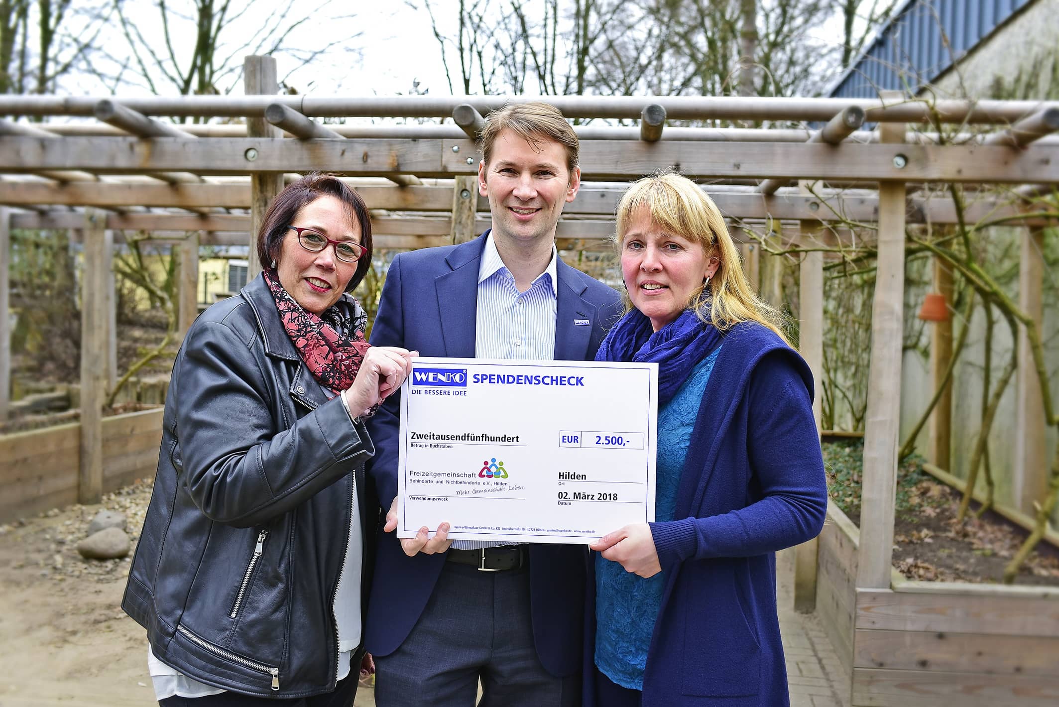 Hilden / Köln. Auf WENKO ist Verlass! Zum wiederholten mal kann sich die Freizeitgemeinschaft für Behinderte und Nichtbehinderte (FZG) über eine Spende der Wenko-Wenselaar GmbH & Co. KG freuen. Eine interne Los-Aktion für den guten Zweck, an der sich Mitarbeiter und Geschäftsführung wie jedes Jahr gerne beteiligten, brachte diesmal die stolze Summe von 2.500 Euro zusammen, mit der die Tageseinrichtung „Ellen Wiederhold“ in Hilden am 2. März überrascht wurde. Die FZG, die mit den Spenden von WENKO bereits in den vergangenen Jahren viele soziale Projekte für Kinder und Jugendliche realisieren konnte, reagiert damit auf den Bedarf einer neuen Kletterwand in der KiTa. In der seit 1989 bestehenden Tagesstätte werden behinderte und nicht behinderte Kinder im Alter von 3 bis 6 Jahren betreut und durch spezielle Förderungsprogramme der Psychomotorik fit für den Alltag gemacht. Besonders wichtig für die Förderung der Vitalität der Kleinen ist die große Sprossenwand in der Turnhalle, die nun dank WENKO schnellstens erneuert werden kann. WENKO Geschäftsführer Philip Köllner bei der Übergabe des Spendenschecks an die stellvertretende KiTa-Leiterin Frau Osewald hierzu: „Es freut mich, als regional ansässiger Unternehmer, aber auch als Vater zweier Kinder, mit unserer Spende dieses besondere Projekt aktiv unterstützen und auf unbürokratischem Weg schnelle Hilfe leisten zu können“.